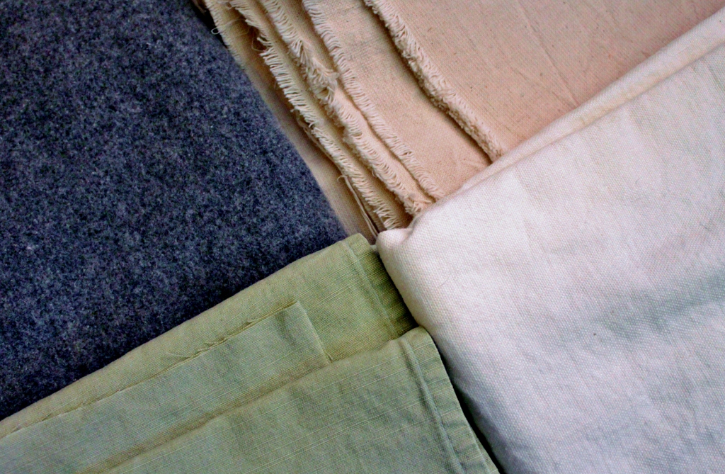 Clockwise from the upper left, in our fabric stash I found a nice grey wool, a heavy unbleached fustian canvas, a lighter white fustian, and a pale green linen tablecloth to use as a lining.