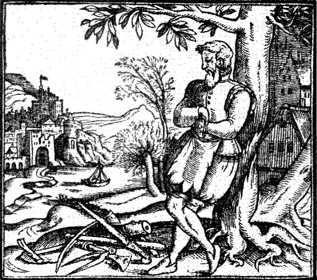 An English chap of the mid 1560’s stands against a tree, a working stiff of some sort, tools arrayed in a pile at his feet. I’ve heard him called a surveyor because of the dividers in the foreground, but I’m not so sure. There’s also a pick axe, handsaw, and claw hammer. Not to mention the apron the man’s wearing, which makes more sense for a carpenter or something than for a surveyor.