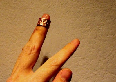 Inspired by a comment Maggie Secara made on the Facebook page, I made this topless thimble (wolf whistle) out of a bit of copper pipe I had lying around. It’s a valid stopgap moves things along to the forming and dimpling stages. It’s a bit of a cheat, admittedly, but it is the type of thimble I prefer when sewing since I tend to push the needle with the side of my finger instead of the tip.