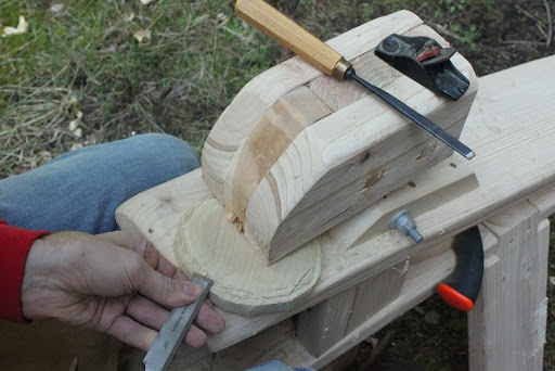 The concept is simple. A piece of wood is cut into a circle and the edge narrowed to be wedged into the croze, forming a seal. In a barrel, this is called the ‘head’, as in the saying ‘cash on the barrelhead’. I had a large piece of tulip poplar lying around and used a coping saw to cut out a circle. Then I used chisels to cut a dado around the edge to slip into the croze.