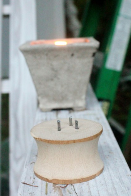Roy Underhill, who explained that the diameter of the piece affected the speed of the turn. So I sat down with a bit I cut from one end of an old maple rolling pin and milled out a pulley, essentially. The trio of spikes will (theoretically) go into the small piece to be turned and drive it at a higher rate of speed.