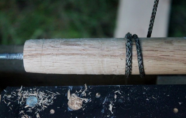 The string started out secured to the springy limb of a pine tree, a suggestion made by Peter Follansbee in one of his videos, but I confess that I eventually swapped it out for a four-ply bungee rope when I got tired of being whipped by the tree for my temerity.