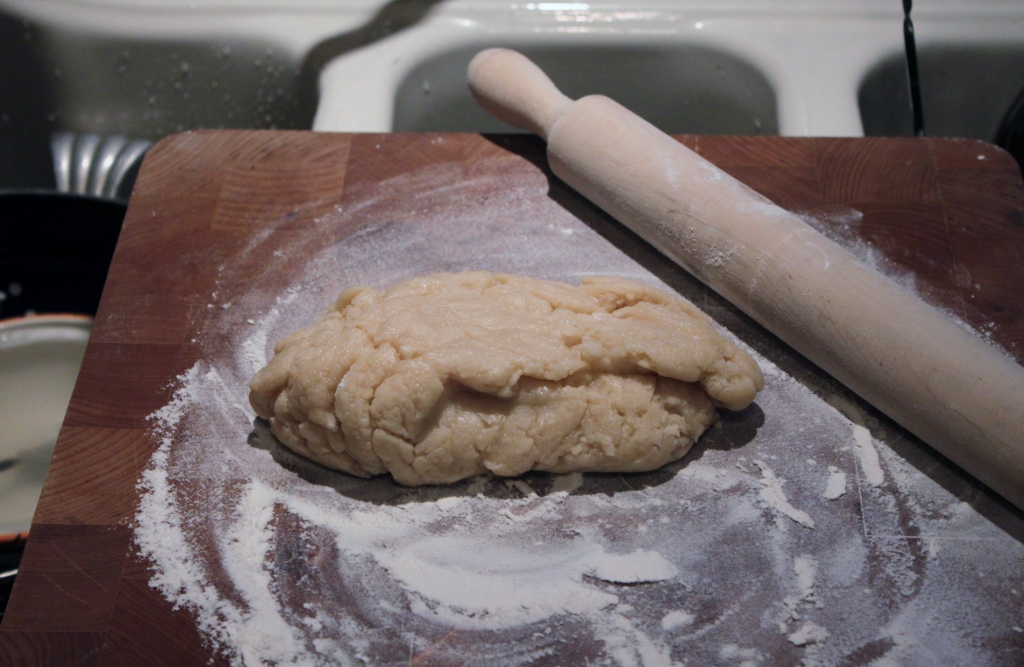 Turn out onto a floured board and divide into six equal parts. Use a rolling pin to flatten into disks about a half inch thick and stack the disks with waxed paper between them in an open bag. Counter for at least four hours or move to the refrigerator and chill for at least two hours. (If you decide to chill, bring to room temperature before you start to work the dough again.)