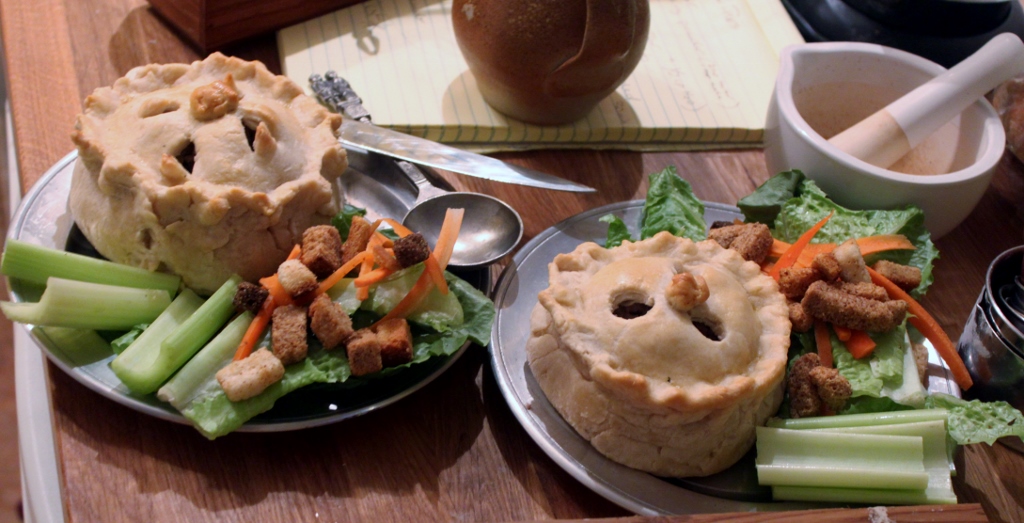 I know going in that pies were often used as simple ways to create fare for the working stiff. Which is right up my alley. A pie wrapped in cloth will stay hot for quite awhile after the working stiff gets to his workshop, a portable hug from his family kitchen. Pies were served to all walks of life, differentiated mainly by the expense of their ingredient list.