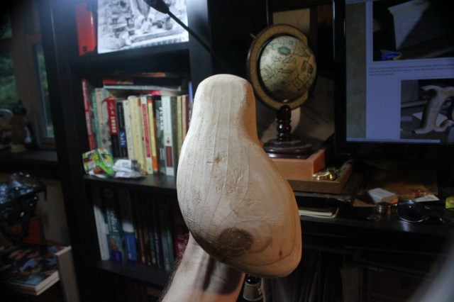Thankfully, in the conversation I had with Francis last night, it turned out I’m not the first aspiring shoemaker to grab a piece of scrap pine and try to turn it into a last. He shared this link to the shoemaking blog Where Are the Elves? Adventures in Historical Shoemaking. This guy turned up an historical last to copy. It’s a ‘straight last’ and I’m making a ‘crooked last’ but more on that another time.