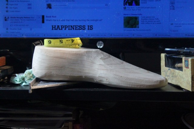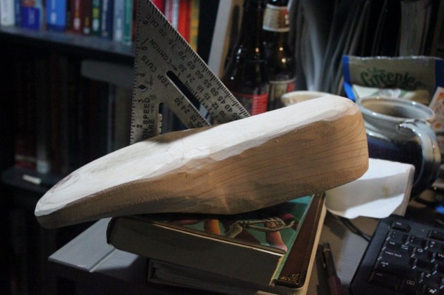 For the record: I’m won’t spend quite this many posts for the second last. However, on advice from Francis, I did go back out to the workbench and spent some more time zeroing in on the correct form of my last. He advised that I raise the sole about a 1/4 inch, sloping from the ball of the foot to the heel. This isn’t to accommodate a heel so much as to accommodate the shape of the human foot.