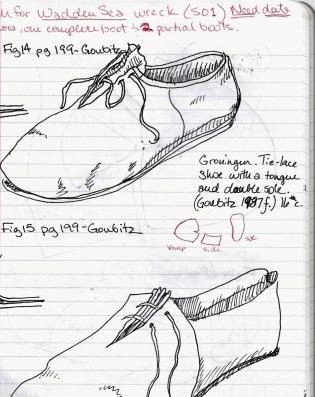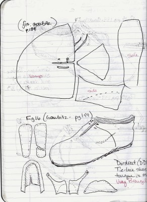 While I was waiting for the USPS to get their appointed rounds out of their dark of night (ahem), I headed to the library to seek out a copy of “Stepping Through Time: Archaeological Footwear from Prehistoric Times until 1800” by Olaf Goubitz. It is essentially the book on the subject. Goubitz, who died in 2007, was a Dutch archaeologist who dedicated his life to the conservation and study of historical leather artifacts, which led to books and articles like Stepping Through Time… and Purses in Pieces. His books are full of tireless scholarship and hand-drawn patterns and replications of shoes from shipwrecks archaeological digs throughout Europe.