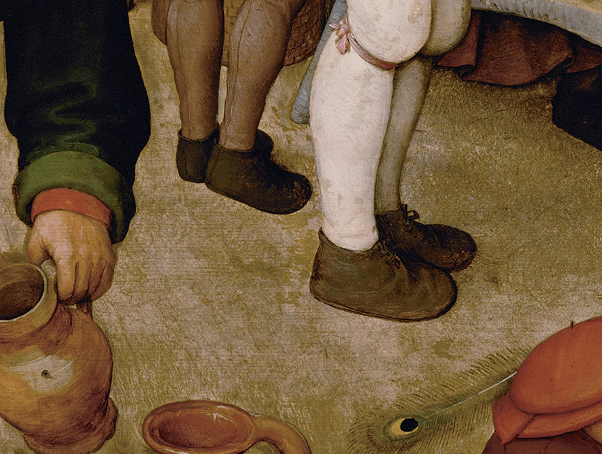 As a painter, I’ve always been fond of the curious and somewhat controversial pastoral paintings of Pieter Bruegel the Elder. Especially the detail on the costumes, customs, and clodhoppers. These are the feet of two bagpipe playing peasants in the painting ‘Peasant Wedding’ clad in some charmingly simple-looking shoes.