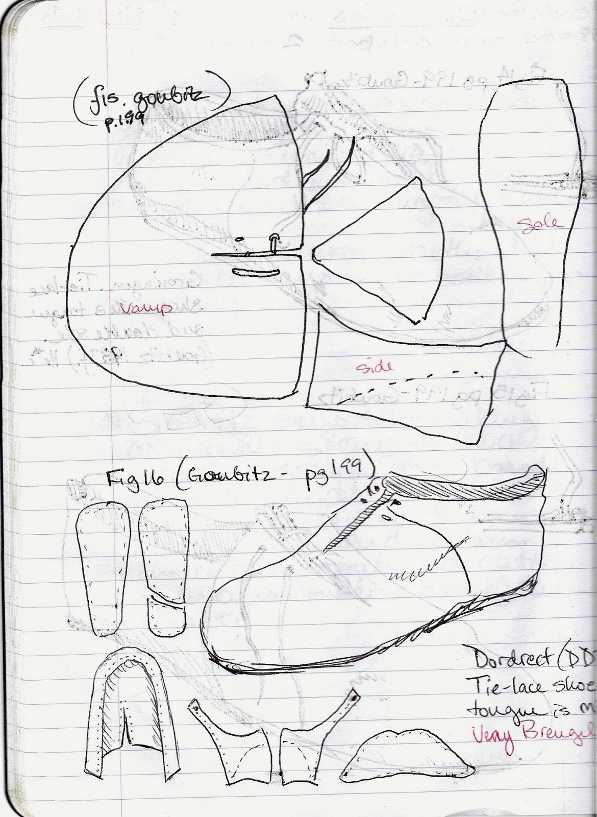 Among the shoes he documented from digs in the Netherlands were these, which I re-drew from his book. Handily, he provided a schematic of the pattern pieces as well, as you can see below.