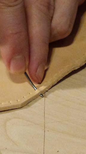 Use your curved awl to create a hole that angles from the mark made by your stitch marker curving toward and out the edge of the leather. The depth should be just a bit deeper than half the leather’s thickness. THIS TAKES A BIT OF PRACTICE. I’d advise using some scraps to practice.