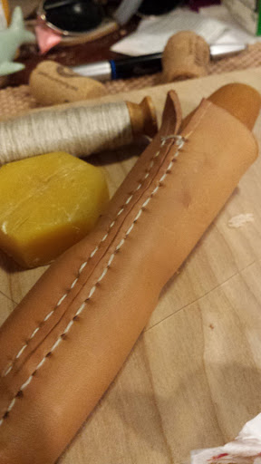 Note #2: If you want to incise, tool, or otherwise decorate your leather, do so before you begin sewing. I admit that I have at least once forgotten to do that. For tools like this one, I like mine a bit plain.